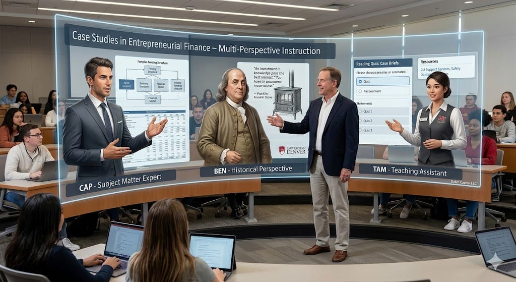 One of them was an AI avatar trained on entrepreneurial finance. Another acted as a teaching assistant, handling quizzes, structure, and student support. The third – and perhaps the most interesting – was a simulation of Benjamin Franklin, built to engage students as an “iconic entrepreneur” with his own perspective on business, risk, and capital.