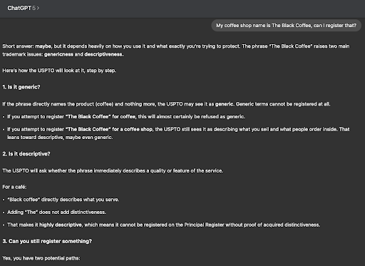 It delivered a full explanation and even walked me through the difference between 1(a) and 1(b) applications. I then pushed further and asked about a hypothetical coffee shop named “The Black Coffee,” and it offered a well-reasoned analysis of the likelihood of obtaining a registration for that name.